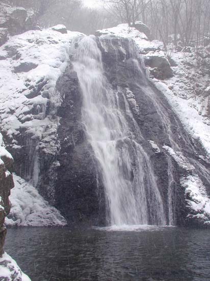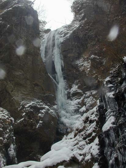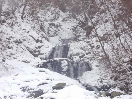 大滝は1月に入ったばかりなのに下から上に氷がつながり始め、中段に付着した氷は前衛岩との間隔を50cm迄に縮めていて、そこがつながったらこの滝の凍結は一気に促進する。そうすれば50mの垂直な(上半部は右肩を登ると垂直を越す)大氷瀑の出現だ。今年は暖冬だと言うが今後も寒波がくればバーチカルアイスクライムがここで夢でないかも知れない。