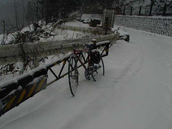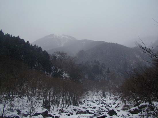合流して暫く走れた道は早戸大橋からは一面の白世界に変容する。駆動力を付けようと腰を浮かすと摩擦力が少なくなるのか後輪が滑る。スリップにバランスを崩し掛けるがそれでも転倒することもなく三日月橋を渡る。上空からは白いモノがチラチラ。雪が降っているのなら不安定はチャリでの走行を思うと即座に帰りべきか。「いやいや」前日までに降った雪が風にあおられて舞っているだけさ。しかし、丹沢観光センター辺りからは確かに降雪中だった。アイスバーンを自転車を押して今はもう使われていない車止めゲートに自転車を止める。直ぐ帰るべきかなとは思う。でも、貧乏人はここまで来ると手ぶらでは帰れない。だいたい天気予報では「午後から降雪」だったんだからこの雪は一時的、極地的なモノで直ぐに止むさ。「イコウイコウ」