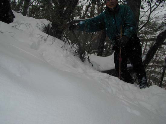 大滝上の1150m付近から瀬戸沢の出会いに下る尾根は丹沢山からの下りには何時も気になるのだが、その分岐までくると「大滝」の魅力に吸い寄せられてしまって、まだその尾根は入った事がない。大滝上までの登りは急登だ。降雪後の先行者がラッセルで苦労したんだろうね、しきりに足を踏み換え小さなステップでしっかり登っている。ひとしきり急登を終え、台地状に出たら下降点だ。