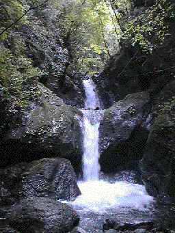 ゴルジュ状の中に3つの棚(1.5m、4m、4m位 写真)があり、いずれも落差はごく少ないが、直登するならば、深い釜を泳ぎ、流れの中を水中呼吸器を付けて登る覚悟が必要だ。技術的にも、オーバーハングしているようで困難と見えた。小さいけれど、白昼のこの時間でも薄暗い中に浮かんで見ると大きく見える棚である。そのまま踏み後をたどり、先ほどの棚を眼下に進むと、傾斜の少ない河原になる。炭焼き小屋の後と思われる窪地が散在している。なぜか、オートバイが一台河原に埋もれかかっている。こんな所まで誰か持ってきて捨てたんだろうか。20分も河原を歩くと、小さなゴルジュ状になり1m、1.5mの小さな棚がかかり、その奧に約4mの棚がかかる。4mの棚も一歩が出れば登れそうな傾斜だが、とっかかりが少なく、やはり勇気がでなくて左岸をまく。巻き路はかなり傾斜のきつく、岩が露出して、その上に砂がかぶっているような、いやな巻き路になる。右岸を巻いた方が易しそうである。この上を暫く歩くと、やがて石積みの堰堤が出てくる。これを越すと、更に堰堤となり、「やれやれ」とのっこすと目の前が大きく開け、奧野林道の終点となる。そこからは見渡す限り、コンクリート製の砂防ダムだらけの人工的度100%のまことに山の自然にふさわしい場所となる。こんな景色を目の当たりにすると、この沢を、更に、上部に遡行しようなんて気持ちは、すっ飛んでしまう。止めた・やめた・やめだ。