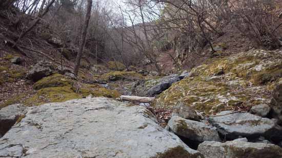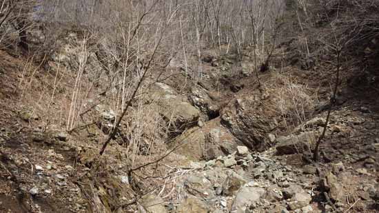 ゴロゴロとする大石が転がるが、狭い幅、左右の岸は低くて水量も少ない。少し歩くだけで尾根の稜線に出てしまうのではないか。