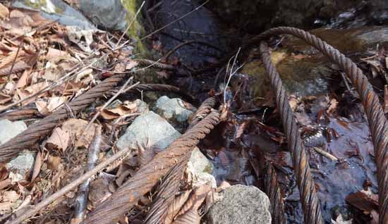ただし、本格化しても滝は出てこない。出てきそうな場所が見あたらない。出会いの狭く小さな感じの沢を砂防堤の上流では水量と周囲の高低差はそのままにして、幅だけを五倍くらい引き延ばした感じに広がり、険しいとか厳しいとかとは無縁に近い・岩床、石畳はあっても、それに傾斜が加わることはなく、ただ大石がごろごろ続々として、CSみたいなのはあっても、悠長な間延びした感じを引き締めることはない。ナメも小滝もほとんど無い。沢の中にとぐろを巻く太い索道ワイヤーは、ここら一帯で大規模に伐採が行われていたことの証であろう。ほかにはなし。