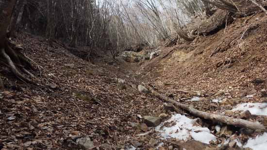 そのうちに枯れ葉の下には雪塊が出てくる(標高1000m付近)。かちかちにかたまっていて、蹴ると堅さだけが返ってくる。蹴っても欠けない。南向きの沢なので雪は無いだろうと見てた。こんな凍った残雪が沢の中の一面に広がっていて、そこに多少でも傾斜があれば登るのに苦労するだろうな。幸いに傾斜を登っているとはまったくない思えない沢である。