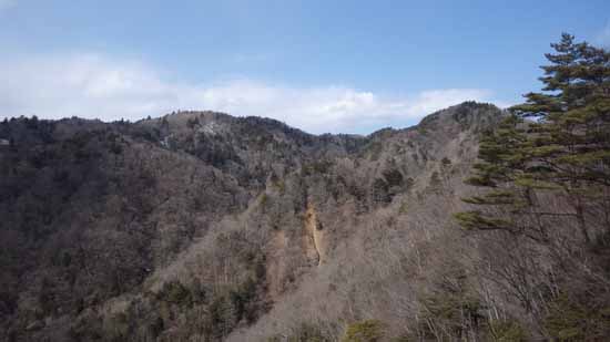 砂防堤を見下ろすように沢沿いの杉林中に登山道から直進してくる経路道が続く。先ほどの砂防堤の先には次の砂防堤が見える。杉の枯れ枝の中にすぐに消えてしまうかと思われた経路は丸太で土留めをされているところもあり、想像したよりも良い道のようであり、四つ目の砂防堤が見えてきたところで沢沿いを離れて左の斜面(造林小屋の裏手にあたる方向へ)を登っていった。