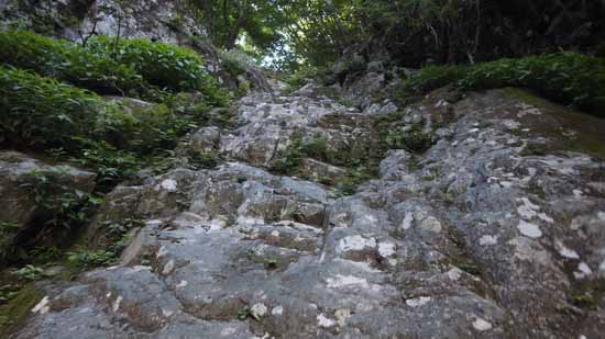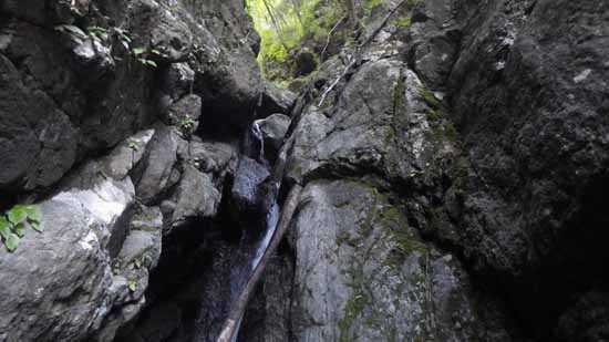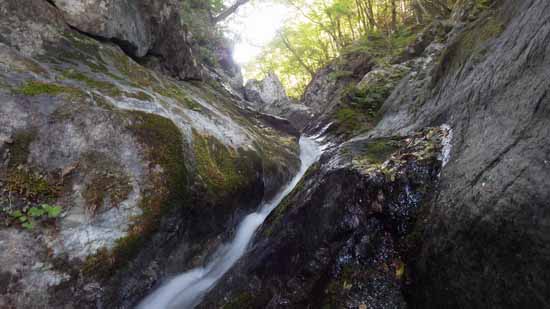 明るい大滝を終えると、しばし暗い沢に変わる。いつものグズグズの岩で出来た岩場を避けて、水量の少ない水流中を行く。そして四段のナメ滝へと続く。