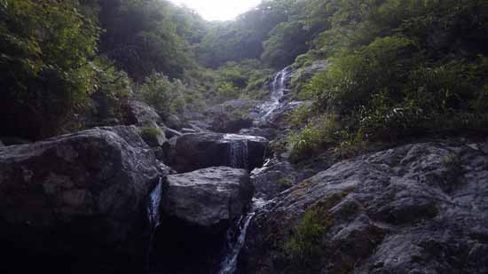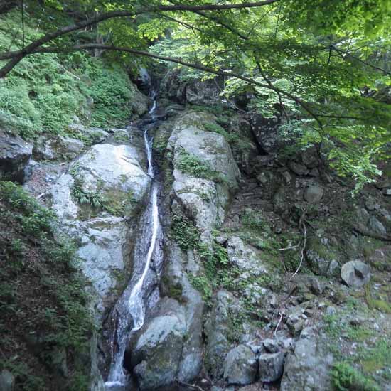 一連の終わりは、付録のような大岩横から3mほどの落水滝である。ハングになるのでこれも巻く。続けて一つ小滝があるが、これは易しい。