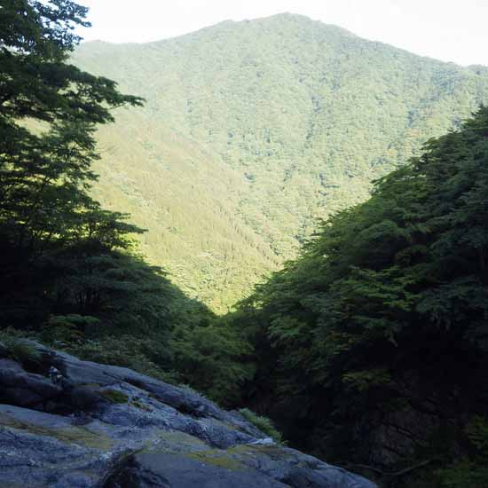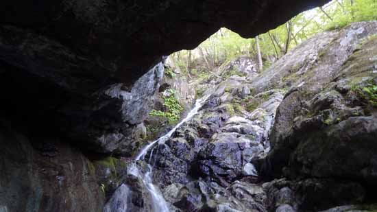 狭かった沢が開け、東を向いた沢床露岩の中央がバルコニーのように前に突き出すようにしていて、そこに朝の光が目一杯当たる。傾斜の落ちた露岩は緩い凹凸を持つスラブとなっていて、凹部には腰を落とすことが出来る。そんな岩の中央を水が流れ下ってバルコニーの先端から下に放たれ落ちる。