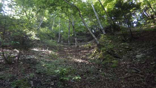 詰めは崩落地では無くて、小木の疎林帯だった。表層には足首程度の低い草が生えているか、あるいは腐葉土の積もっていて、踏み込む地面は軟らかくて足を取られることもない。ただ掛け上がれるほどには緩くはなくて、数mの間隔で左右に走る獣道に乗っては、その都度一息ついて休む。それも長くはなく、何回か目の息継ぎの後に尾根に乗った。何処の小尾根だろうか(本間・円山木沢の中間尾根である)。
