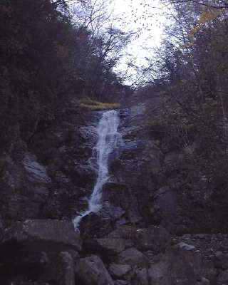 例によって、フカフカの絨毯のような踏み跡をたどって15分ほどで登山道の標識に出る。標識には丹沢山まで3kmと表示され、マジックで「ここが本当の中峰」と書いて有る。このあたりは既に紅葉は終わっていて常緑樹の青さと枯れ枝だけが目立つ。さてどっちに下るか。本来ならこのまま本間の頭に出て、丹沢観光センターに出るのが時間的には短いのだが、大滝沢の大滝を紅葉の中で見てみたかった。