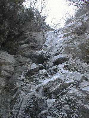 今日は、夕方から定年前退職の先輩の激励会があり、一応幹事を引き受けているので、3時までには自宅に帰らなくては行けない。自宅を少し早めに出て本間沢出会いまで自転車で来た。途中、鷹が一匹、落石防止の防護ネットと路肩の間に入り込んで、ばたばたしていた。助けようとしたがネットは高く、長く、網を破るような道具も無く、ただ見ているだけで切り上げた。今日は円山木沢だ。円山木沢は、前の冬に冷やかしに来て、結局なにも出来ず、そのまま帰ったところだ。伝動からは、ブルドーザーでかきならした痕跡の道をたどり河原に着く。水量が予測していたより多い。途中のローム層の土壁には霜も降りていた。まだ朝の8時で、結構寒い。自転車のペダルを漕いできた足先が、まだこわばっていて、入り口の3mの小さなへつりのスタンスが決まらず、途中で躊躇し下を見ていて、水浸しになってしまった。いきなりこれだから、今日はどうなる事やら。その上の3mはどうということもない。すぐ(F2)20mの大滝だ。昔登った記憶によると、下部はだんだんだが最後の3mほどがスラブで傾斜も結構ある。そこの一歩をハーケンを掴むか掴まないかで難しさが決まる。昔は腐って折れ曲がったハーケンが1本だったが、今日上部から眺めたら確保用にボルトが5本、ハーケンが3本も打たれていた。ザイル無しで登るところでは無いので、素直に左岸(右側の)の踏み跡をたどる。あまり高く上がらないで簡単に落ち口の横に出る。
