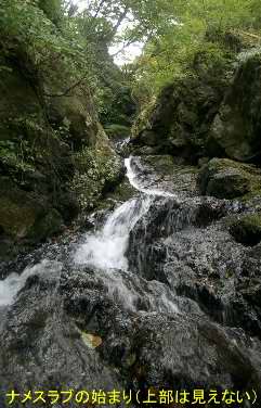 傾斜のややきついスラブのナメ滝、これはやっかいだ。なにがやっかいかというと、取り付くには水の中に一歩だけ入る必要があるのだが、是の踏ん切れない。