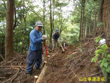 聞いたところによると標高1000mまでの仕事道作りを二人で請けて、夏から仕事に取りかかったそうだ。前年に工事に必要な木材を森林組合の認可をもらって間伐した杉で調達しておき、丸太を止める杭を2m間隔で打ち、それに丸太を渡してから路肩を切り、丸太を削った土でならして固める。間伐材の無い部分では雑木(椎やブナ)を切り倒して土止めにする。70過ぎの老人にとって一番ツライのは、土止め材の丸太を「えんやコラショ」といって運ぶ作業だそうで、急斜面は若い人に手伝ってもらわないと運搬が出来ないそうだ。