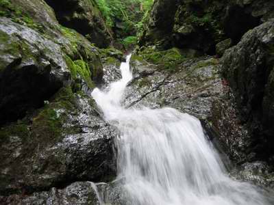 続くは岩も黒々した10mの滝を登る。何回も来ていれば、流れの左側が簡単に登れる事を直ぐに思い出す。しかし、量は少ないけれど、上から水が垂れて濡れているのに加え、水苔が付着していて滑り易い部分もあって油断は禁物ということも思い出す。おまけに岩は冷水に冷やされているから、さっさと登らないといくら良い季節だと言っても手先が冷えてしまう。