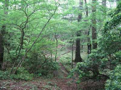 そうなったとしても、ヌタの丸に行くのを諦めたのでは無いというのもズルズルと下降を続けた理由である。というのは先に述べたように尾根道はもともと草深く、ヌタの丸から登ってきても合流点が分かりにくい程だから、下りで分からなくても当たり前という気持ちが湧くのと、丹沢観光センターへ続く、この道を降っていけば、もう一箇所、ヌタの丸に山裾をトラバースしていく猟師道があることを知っているからだ。こちらの方が急な箇所には虎ロープも張られていてしっかりした道である。それは仕事道がゴロゴロしてきた先の大岩の所から始まるはずだ。