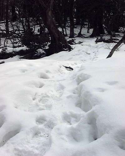雪が減るとともに、しばらく前にここを降ったであろう思われる足跡が凍った雪の上に残るようになる。
