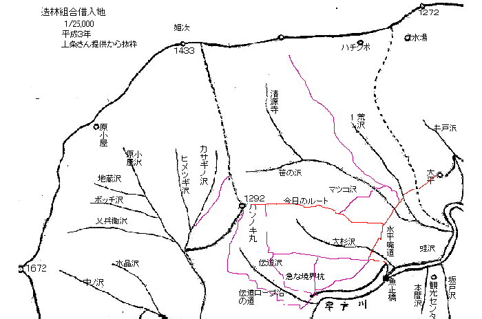 鳥屋に、ご両親が在住のIさんから【鳥屋山】の概念図を頂きました。鳥屋山とは、焼山から蛭ヶ岳〜丹沢山など早戸川流域の山々全体をさし示す名称のようです。今回のルート図は、それを元に作成しました。いろんなガイドブックや地図に、いろんな地名が掲載されていますが、この地図は、山林の借り入れ範囲を記述するためのもので、そのために細かい沢筋まで明瞭に地名が記載されていて、分かり易く作られています。今まで、いい加減に命名していたマシラの沢の名称も、この【鳥屋山】を基に過去の遡行図の沢の名称を修正したいと思います。Iさんありがとうございます。