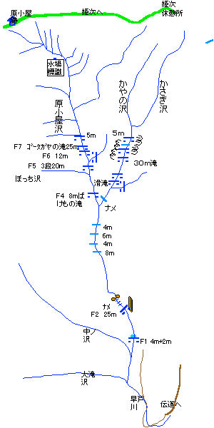 最近こちゃこちゃした沢ばかり行っていたので、高い空の下、たまには晴れ晴れとした沢に行きたい。そんなとき宮ヶ瀬の原小屋沢は、お勧めとガイドブックが誘う。以前に1回遡行したが、どうもガイドブックとは棚の位置が違っていたし、抜け出たのが姫次の休憩所ときている。どうもすっきりしていなかった。そのとき、参考にしたのが昭和45年のガイドブックで古いとはいえ、あれだけ違っていると、どうも違う沢を登った可能性もある。