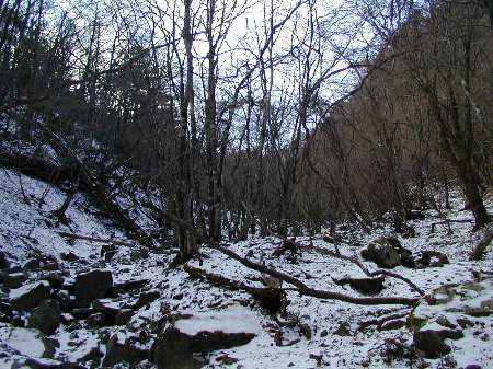 (写真 合流点)出会いにはわずかばかりの水の流れがあるが一歩はいるともう流れる水はなく、水たまりの水は完璧に凍り付いている。また、出会いの少し奥に5m程の滝があるが、それを越すと源流まで滝らしき物はもう出てこない。