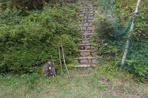 右の石垣に設けられた石段が登山道の入り口だったかなあ。山道を下るために使ったと思われる枯れ枝杖二本が20段の石段横に立てかけてあった。