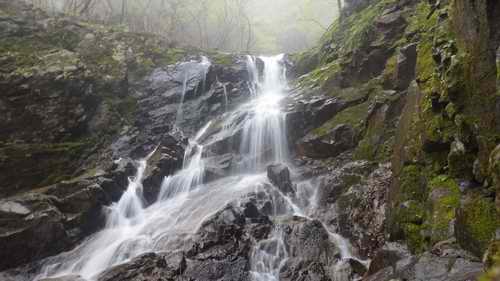 左側のランペ状を登って上の岩を乗り越す易しい滝だ。見上げると落ち口の上には霧が降りてきているように見える。実際には、滝の上に重なって見えている林のあたりにかかる霧だから、少しは距離があるはずだろう。