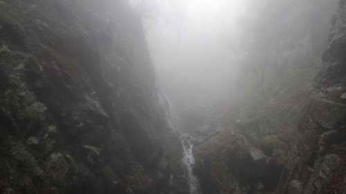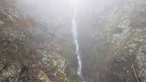 霧にマスキングされて下からは落口がはっきり見えてない。ホールドは豊富で、難しい滝ではないと知っていても、こんなに日には水流中を行く気がしなくて、左の巻きルートから登る。落口から下を眺めても滝壺がはっきりして無くて、雲上から下を眺めている気分に浸るだけだった。