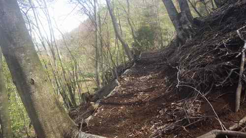 木が生えている土の緩い斜面に付けられているからだろう。下るに従って道形が不明になる。路肩の丸太が腐って形を無くしている。土壌が土から砂に代わり、砂が小石集積に変わると道でなくなる。雨で山の斜面毎砂が流れてしまって道が崩れてしまうのであろう。