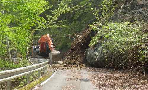 土石が積まれていて通れない。崩落して網にかかっていた土石、それをショベルカーが引いて下の路面に落としつつ、大きなホッパーで掻き出作業中だったのだ。