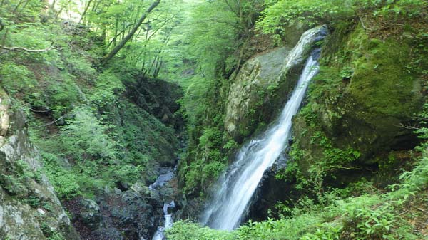本流が若干狭くなり、小さく曲がって戻ると本を開いたような12m滝だ。