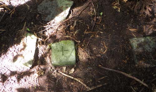 標石が落ちて積もる杉の枝葉の下に埋もれて、見えなくなっていたので、靴で枝葉を蹴り散らし、腐葉した土は杖で掘り、