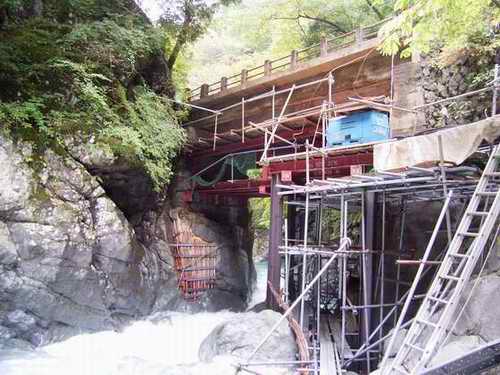 観光センターの裏手から導水管沿いの道に入り、左手斜面に入っていく登山道から別れ、小沢に落り、小さな流れを突っ切り、砂防堤上で本間沢に出る。