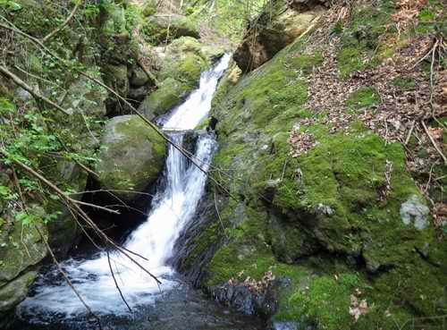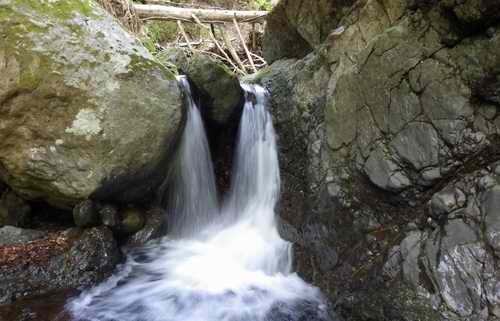 狭い沢なのに水量もある。だが出会い部分を過ぎると小滝状はたくさんあっても、滝そのものが少ない。林道終点までの間には一つ小滝だけだ。