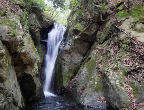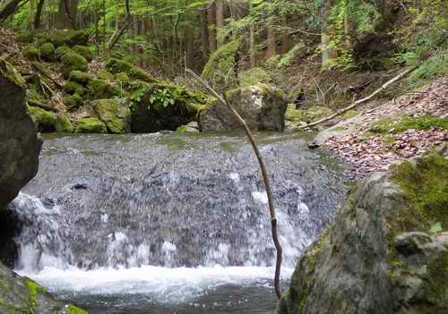 水沢川水系の下流部はほとんどがこれに似た岩で出来ているようだが、岩本来の色が黒であるかどうかは知らない。小滝は二段だ。下の滝の落口が堰となっている上の滝との間には滝の大きさの割にはずっと広くて深い小プールのような釜といえるが、蛭のメッカみたいに思えるここらで水浴び遊びをする勇気を持つ人は皆無だろう。右の上方を見あげると林間にガードレールが見えてる。伊勢沢林道が音見沢を経由した後に山裾を大きく回り込んでこの沢の近傍に戻ってきているのである。