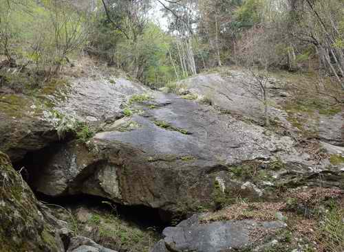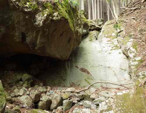 二俣左入口には大きな岩小屋があり、それの右には乾いた7mほどのスラブフェースが見えている。