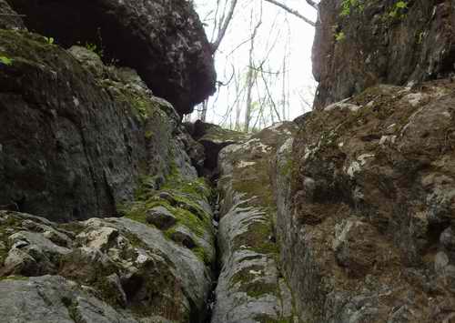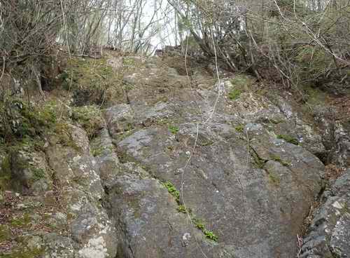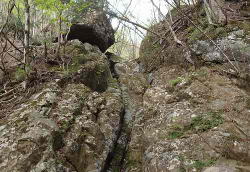 「おいおい・どうやってこの涸棚を巻こうっていうのか」一見目はそう思った。当たりは険しい地形だ。どうしようかという目で見直すと急に見えていた樋状は傾斜度が50°は越えているが、60°は越えてないのではと分かる。苔が所々に付いているが、樋状は雨時には水が流れ、大水時には土石が落ちて岩を磨くが、常時水があるのでないから水垢はほとんど無い。それに樋状である。フェースの場合は岩そのもののフリクションと順層のホールドが頼りだが、樋の場合はそれに加えて左右の突っ張り力、溝に足をつっこめれば楔力が使えて、それに体が空中に晒される面積がフェースに比べて狭まってその分だけ安心感が強くなる。