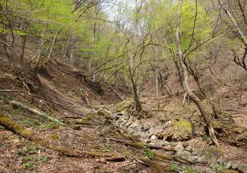早戸川原小屋沢の源流部に似ている稜線下の歩きだ。それでも小さな分岐が右に左に幾つか分かれると幅が徐々に狭くなって、古い倒木・枯葉が堆積するようになって、どこかの分岐を左にちょっと登れば東海自然歩道に出るんじゃあないかな、と思えてくる。だけど今日は我慢である。とことん行けるところまで行って沢を詰めるためには、分岐点では一番沢の形が整っている方を選んで。