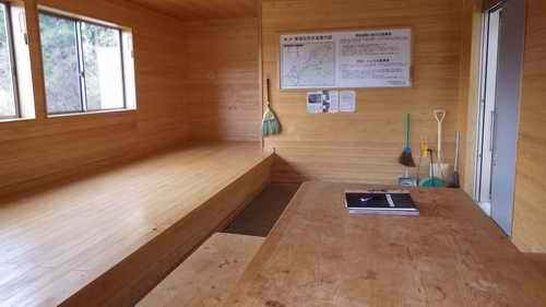 それで避難小屋まで行く。芝の草地中の台地に更新された小屋は稼働から日が浅いこともあって綺麗である。以前にあった焚き付けが難しいストーブも無くなってみれば懐かしいが、断熱性能の良い材料で造られた小屋の居心地は今回の方がずっとましになったに違いない。実際にそうかどうかは泊まってみないと分からないが、宿泊の予定は当面無いので今後も断定は出来ない。若干トレイが汚いのは、尻癖の悪い奴が紙は全て持ち帰れと言う注意書にびびって尻穴の方向を制御する筋肉が痙攣して横にずらしてしまったからだろう。ちびっとだから許容範囲としてもいいだろう。