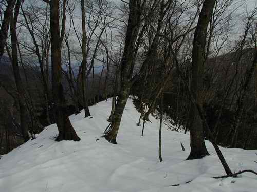 堅雪の斜面にはスリップに注意して気が抜けないが、斜降を繰り返し、やがて尾根上の仕事道跡に出る。 その道は正面に大滝を見下ろして下る道になる。