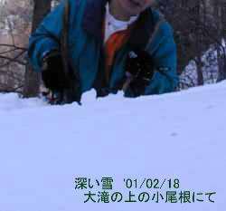 だが、大滝の滝壺から尾根に登るところのルンゼでは深い雪。顔の辺りまですっぽり埋まる。傾斜も急だからナダレのおそれも少しはある。小尾根に出ても腰上までの雪が続く。膝で前の雪壁を崩してからもう一度踏み込むという完璧に大雪のラッセルだ。登高路は判然とせず急傾斜が続き、尾根に出て所であきらめた。少し下に大滝の落ち口が見えるところだ。スノーハイクをしゃれ込むにはちょいと早い丹沢の薮尾根_冬物語