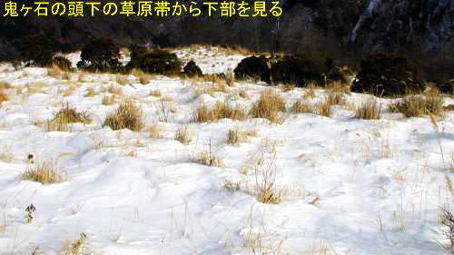 遅くなったもう一つの理由は、雷滝を見てから大滝沢に向かった途中、まだ50cmは残っている残雪の上に本谷沢と中ノ沢の中間尾根に上がる踏み跡があって、それがどうやら正確に登山道を登っているように見えた。その後を追って植林帯から草原帯に上がり、丹沢山の一角である鬼ヶ石の頭まで登って来たからだ。