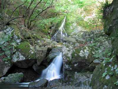 その上に3m程の緩い滝が重なり、登り切った岩の右手の斜面から清水がコンコンと湧いて出る。
