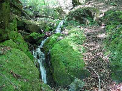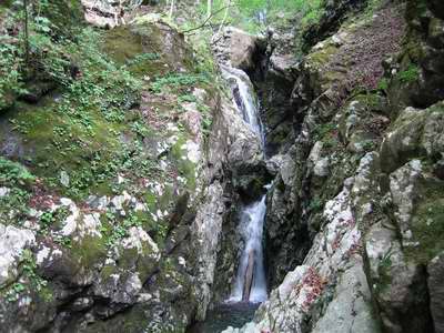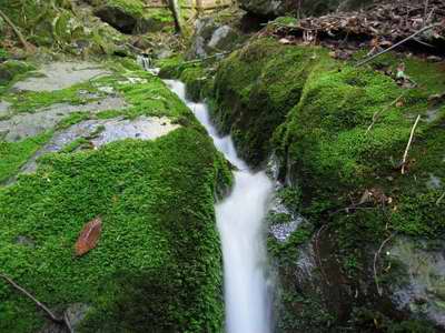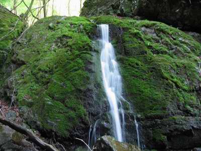 小滝の上の樋状 苔の岩をはんで水が流れる