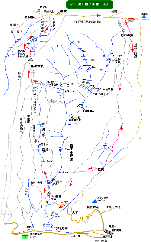 この上端部はゴーロの沢につながっていて、このまま沢を詰めていけば榛の木丸−姫次稜線へ行く途中の切り通しに出ることができる。途中に顕著な滝はない。