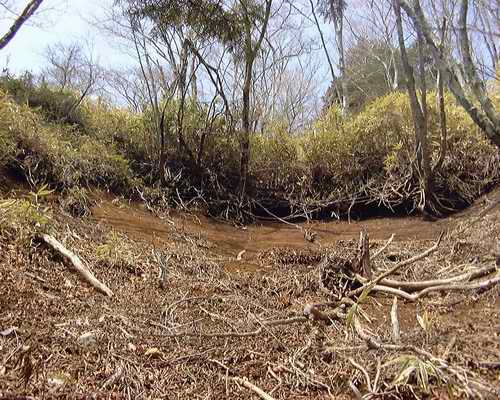 このまま原小屋沢のように笹原に入って、稜線に至るのかな〜