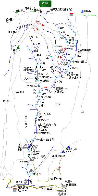 マゴ小屋沢右俣は先週行った間子沢の中流部で2(左):1(右)の水量で分岐する沢で、左俣が榛の木丸と姫次の稜線に突き上げているのに対して、上部稜線へ直接突きあがっています。やはり格別に困難な滝はなく、源流部の近くまで水流があり、明るく開けた沢であり、初心者には格好かと思います。