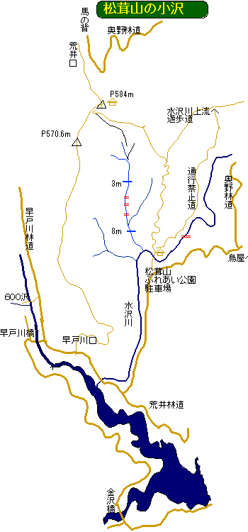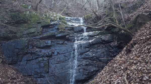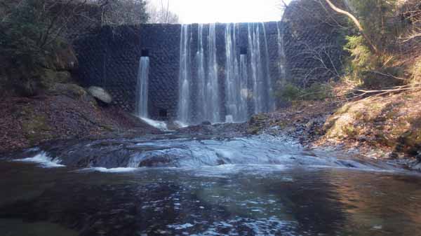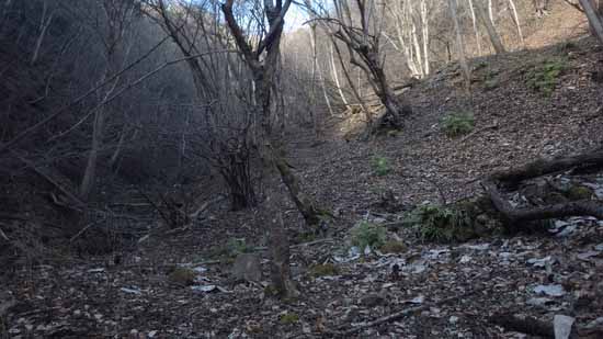 予定の公園に入り口までは約一時間の予定に30分遅れで着いたが、色々あったことを考えれば上出来だ。水沢川を渡る公園橋の袂に自転車を止め、松茸山へのハイキング路に入り、道を登りだしてすぐの斜面左手の杉林を突っ切って、今は足の置き場もままならないが、おそらくここは道だったはずの沢沿いの踏み跡に入る。百mほどトラバース気味に行ったところで左下の沢に滝のようなものが見える。そこから枯葉の斜面を下った。枯葉の下は岩面らしく積もった枯葉と一塊になって滑って沢に着く。