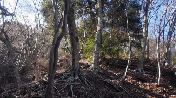 沢の主体が、砂地から石の砕けたのに変わる頃から沢の形が無くなるまでの間は倒木が多かった。新しいのはほとんど見あたらず、登る助けにと掴んで引っ張ると「ポキッ」と折れてしまう。進路を遮る径10cm以上の丸太のようなのも、渡るのが面倒なので乗ると抵抗感なく折れそうなのが多かった。