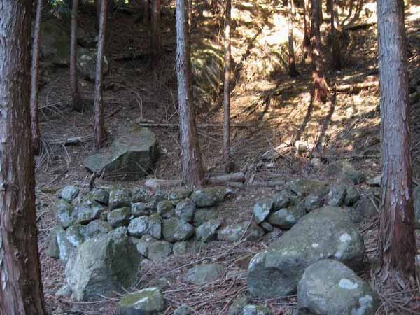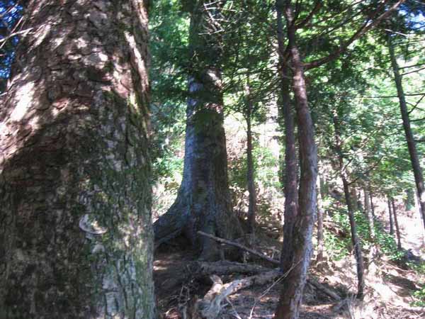 そこは道跡がある。薄い踏み跡だが確かな道形だ。道の付いた尾根は小さい。だが古来の道らしく、江戸の時代に伐採を禁止されて今に残ったらしい大きな黒樅の木が10mおきくらいに立っている。この大木は今は獣道と区分けができないような道だが、山仕事が盛んな時代にはおそらく立派な仕事道だったことを想像させるに十分なものである。急なのでバランスを取りながら登る。上部で露岩に行く方向を阻まれ道形を失うが、稜線はすぐそこにあって短い距離である。