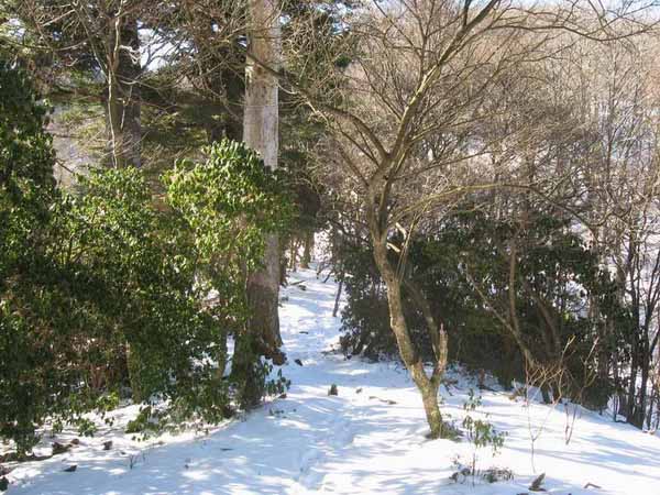 トレールからはアイゼンを付けた数人が丹沢観光センターへ下っていってことが分かる。ここらあたりから東峰直前までは傾斜度の少ない二重山陵の中間の林間を縫うような登りなので、雪の時期には雪を楽しめるし、新緑時にはミドリが綺麗でマシラ的には好きなエリアである。