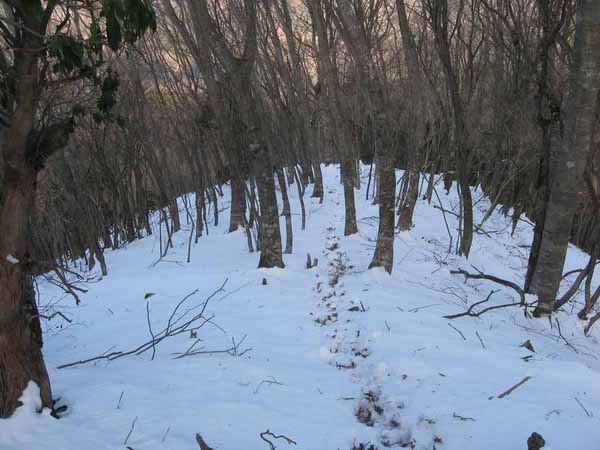 降り出すと、降雪後に歩いた人はいないってことが分かる。そして直ぐに足の先に冷気が浸みてくる。踏んでいない乾いた粉のような雪が、踝の見える運動靴の隙間から内部に入り込み、特に踵側が冷たく感じる。でも冷たく感じるのは靴内部が全部濡れるまでの間のことで、全部が湿ってしまうころには足先が自ら発熱してポッカポッカの状態になるので、寒いなんてちっとも感じない。もう一段寒くなると神経が麻痺して寒さを感じなくなり凍傷に至り、その状態のままで更に一晩山の中にいるなんて事になれば只では済まないかも知れないけど、ぽっぽっと指先が発熱した状態のままで下山できるのが何と言っても丹沢の強みなのだ。少々難を言えば、990円の運動靴のトレッドは浅く、雪の中では全く滑り止めの用をなさないという点がある。そこは、スリップしてバランスを崩しそうになった時に、とっさに手にした立木がボキッと折れて手に残ったのを身の丈ほどに調整したのがちょうど良い杖になってくれた。以降は傾斜地を歩いているのか、滑っているのかを半々くらいに降りませて下降していく。