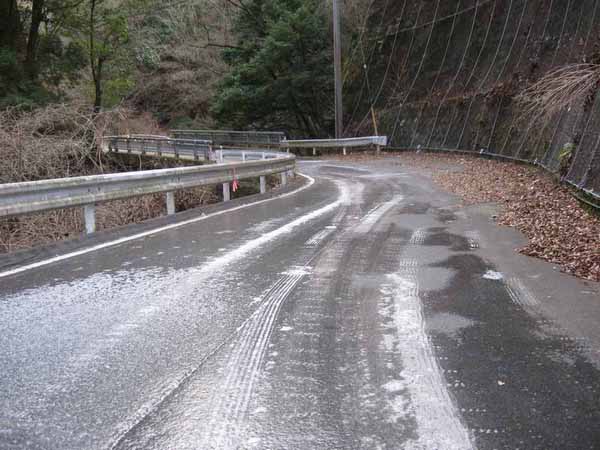 氷をできるだけ避けるようにして歩くが、そうはいかない距離もずいぶんと長い。さっさかと歩くわけにはいかない。出来るなら12本爪のアイゼンを用意した方が良い。転落防止にはピッケルかバイルも持った方がよいだろう。ここらあたりで、そのような装備の人をみたら、用意の周到さに私は深く尊敬のまなざしを向けるだろう。現に、車でここまで来たが、とても苦労したのが見て取れるような跡を一台の車が残していた。鎖チェーンで削り取った道路のアスファルトが粉になって盛り上がっている。二箇所くらい山側の法面にぶつかった跡もあった。